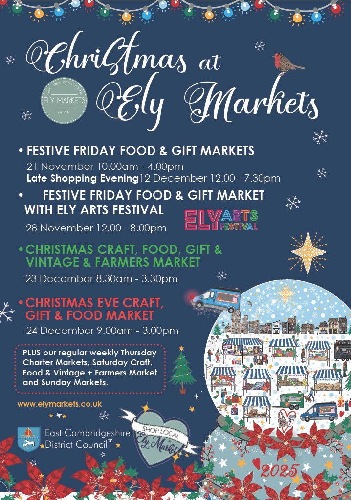 On Friday 28 November, we have a late-night special Food & Gift Market from 12.00 to 8pm, with entertainment provided throughout the day by Ely Arts Festival.